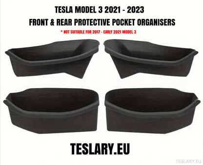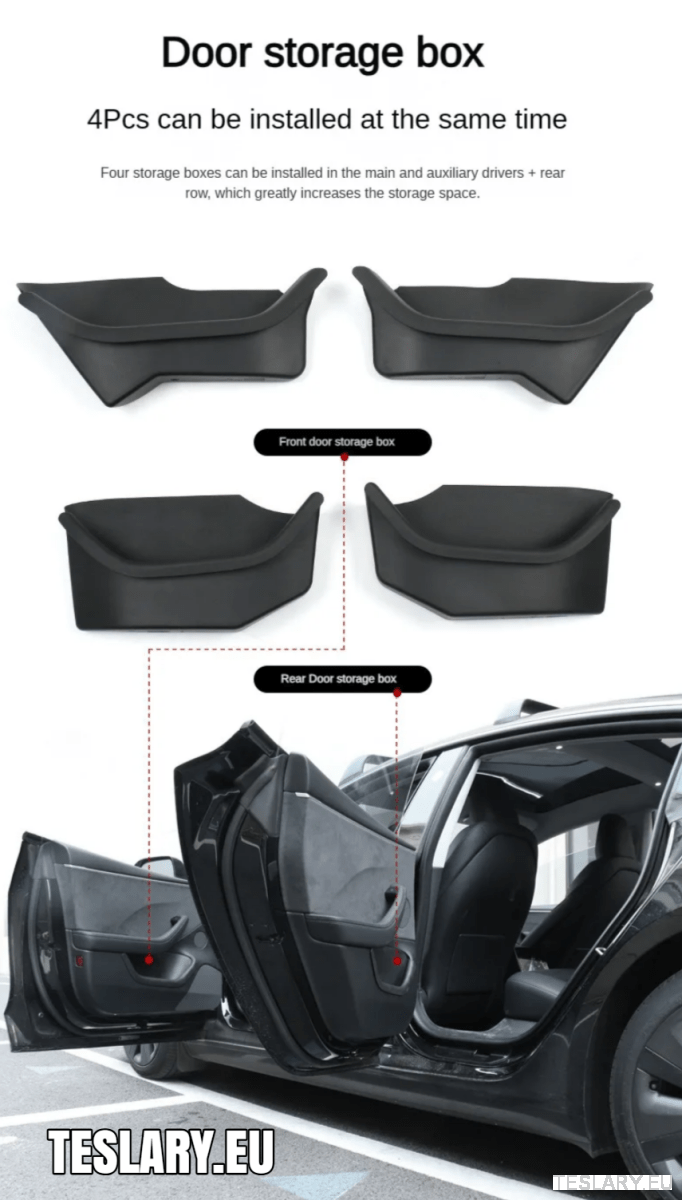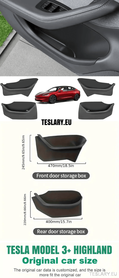 Tesla Model 3, Y & 3+ Highland dørsideopbevaring beskyttende lommeorganisatorer, vandtætte fuldt dækkende for- og bagdørsbakker, 2 eller 4 dele, TPE-plastorganisator