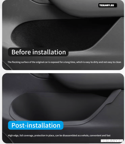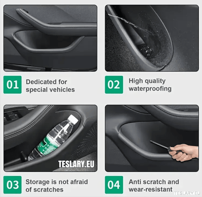Vandtætte dørlommebeskyttere, der er nemme at installere og fjerne, så du kan rengøre opbevaringslommerne i dørene på din Tesla. Disse beskyttende lommer er lavet af robust og fleksibelt TPE-plastmateriale af høj kvalitet, og de sikrer, at det tæppebelagte område af dine originale dørlommer ikke kommer i kontakt med noget, du opbevarer i lommerne, og de er nemme at fjerne for rengøring. Disse lommer er kundedesignet til hver model i Tesla-serien og sikrer en god pasform til din Tesla Model 3, Model 3 + Highland eller din Tesla Model Y. Derudover er lommerne vandtætte, så hvis du spilder vand eller en sodavand i opbevaringslommen, kan du nemt fjerne lommen, hælde væsken ud, rengøre lommen og derefter sætte den på igen uden at beskadige eller plette det originale tæppebelagte område af Teslaen.