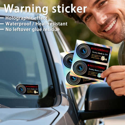 4 Sentry Mode Black Camera Recording Stickers with a Red Label Saying "Camera! Sentry Mode Activated." Removable Stickers for your Tesla