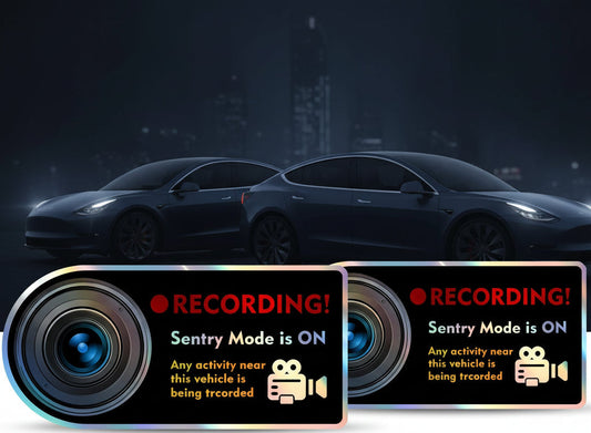 4 Sentry Mode Black Camera Recording Stickers with a Red Label Saying "Camera! Sentry Mode Activated." Removable Stickers for your Tesla