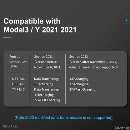 *1. The specially designed USB docking station is compatible with Tesla Model 3/Model Y 2021-2022(after the Nov.6th, 2021) center console perfectly, without affecting the interior look and normal use of the storage box.