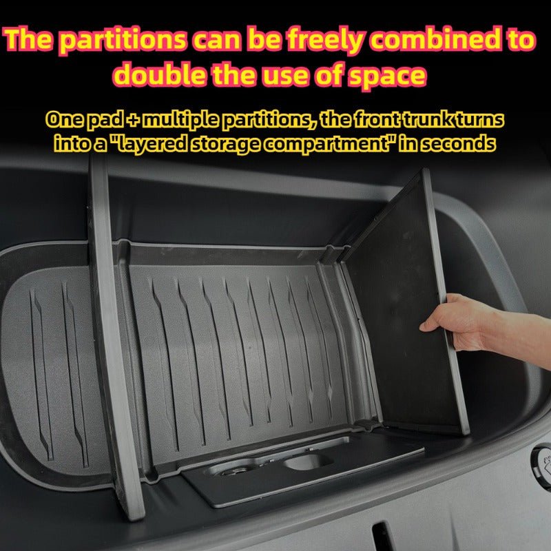 Tesla Model Y Juniper 2025 Upgrade TPE Front Rear Trunk Mats/Storage Box Pads, The Partitions Can Be Freelycombined to Double The Use of Space, One Pad & Multiple Partitions The Front Trunkturnsintoa "Layered Storage Compartment" in Seconds